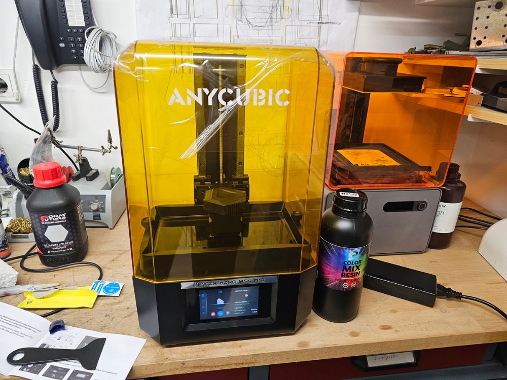 Tipps von Kollegen brachten mich auf den Anycubic Photon Mono M5s Pro. Bestellt, zusammen mit etwas Harz und Zubehör, und nach wenigen Tagen war die Kiste dann da.