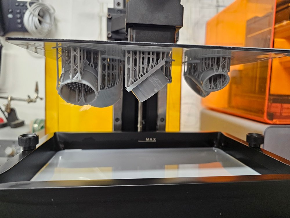 Danach habe ich graues, sog. "ABS-like"-Harz von Phrozen getestet, und bin sehr zufrieden. Gaaanz so zäh wie ABS ist das Harz dann am Ende doch nicht, aber unmittelbar nach dem Druck noch leicht biegsam, so daß sich Teile superleicht von der Druckplattform lösen lassen. Nach dem Aushärten ist es dann komplett hart; anders als z.B. das "Tough"-harz von Formlabs, das immer etwas weich geblieben ist, und nicht formstabil war.