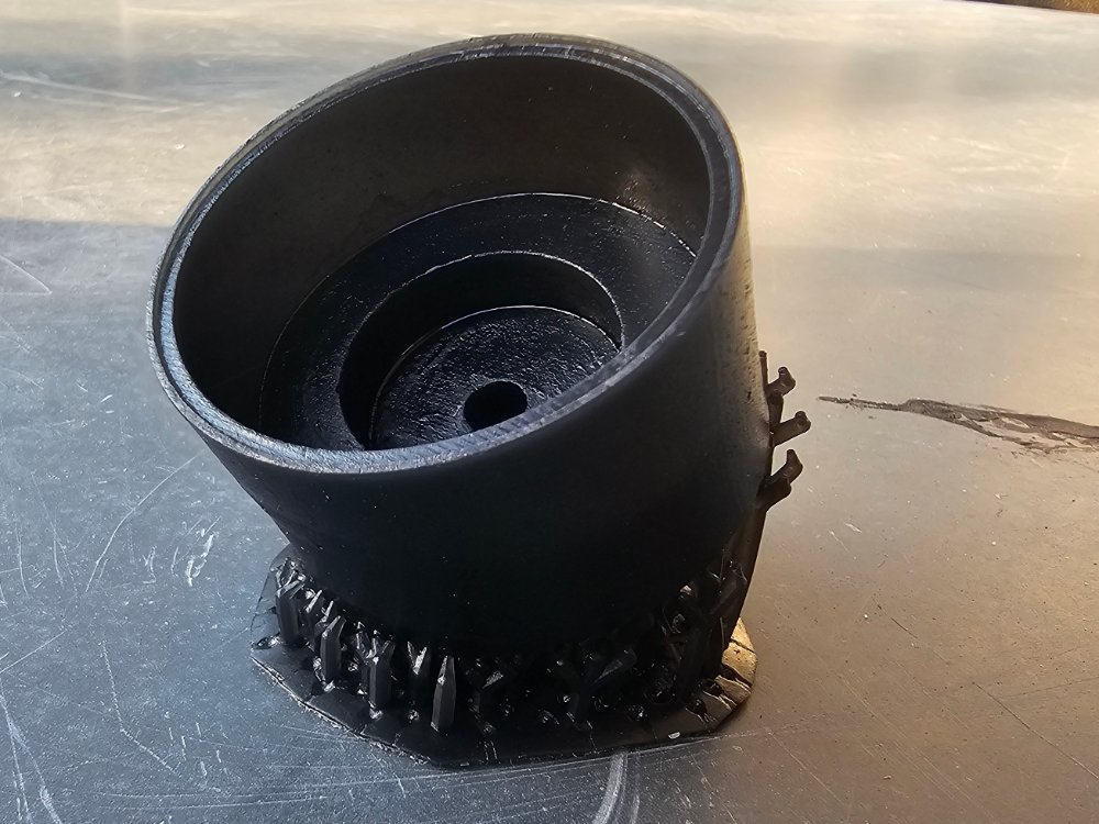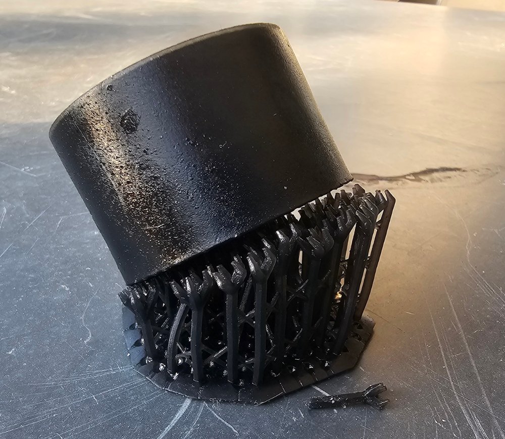 Einer der kritischen Faktoren scheint das Gewicht des Bauteils, und die Größe der Support-Pins zu sein. Bei diesem Teil, das ich mit "schwerem" Support gedruckt habe, hat der Druck dann zwar funktioniert; aber schon beim Waschen hat man gemerkt, daß sich die Supportpins superleicht vom Bauteil lösen:
